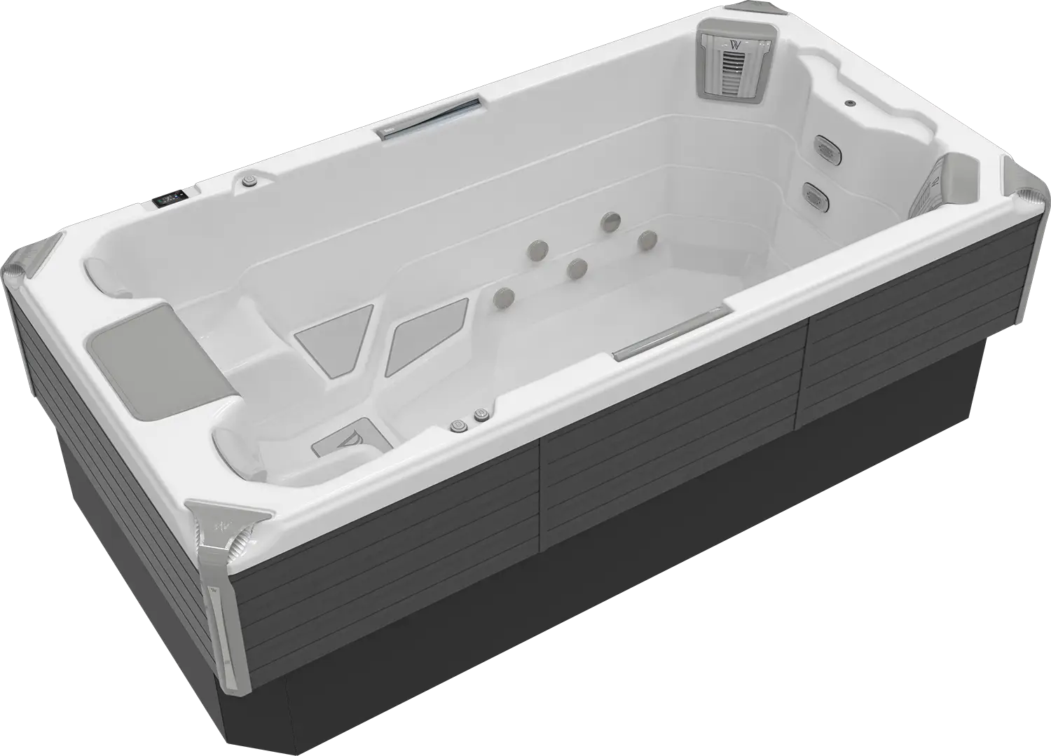 In een traditionele swim spa moeten de pompen handmatig worden in- en uitgeschakeld om de juiste waterstroom te vinden voor het gewenste trainingsniveau. Onze swim spa’s zijn uitgerust met een geavanceerde, nieuwe zwemsoftware. In combinatie met het innovatieve W-Flow systeem veranderen ze in professionele trainingsoplossingen.